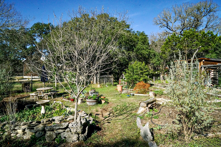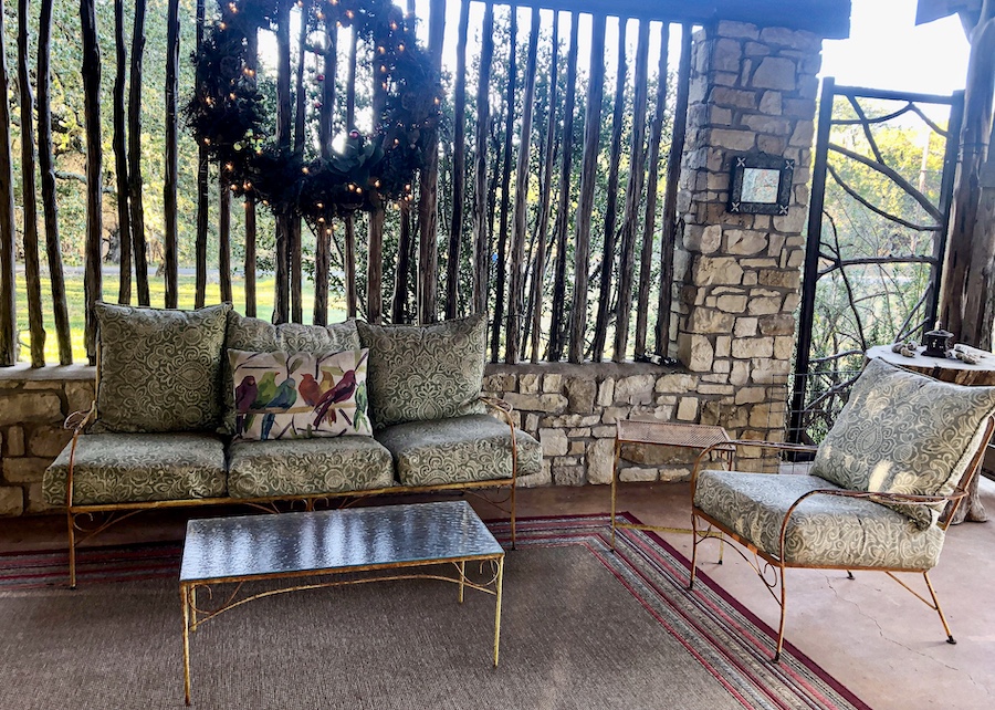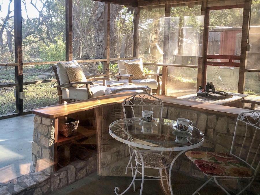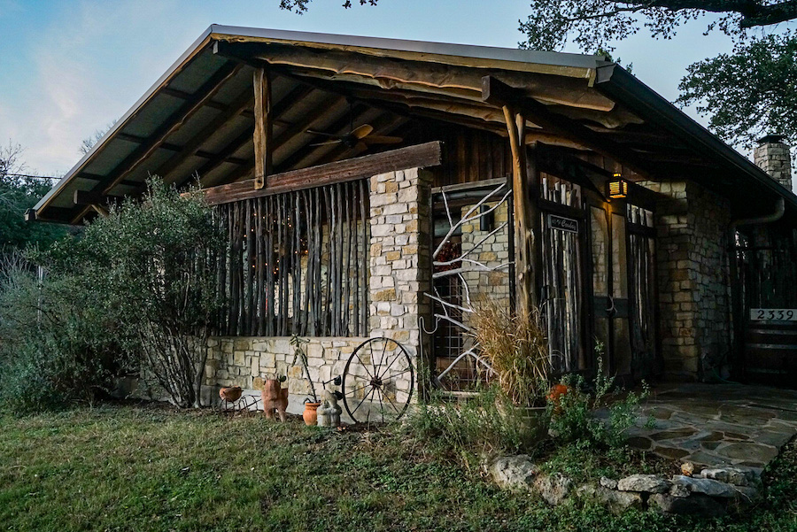 Detoured on the 84 to get away from the I-35. From the 84 on to the 281 to get in to the Texan Hill Country. Going by the ‘Heaven Bikers Church’, on through Evant, a lot of which was closed up….a sign in Marble Falls read ‘No Rules Just Jesus’ another for ‘One Swanky Shop’. Arriving in Wimberley Texas we ate at Chili’s on the creek, outside with the sun on our backs…a welcome change from the bitter cold of the past week. Went to HEB supermarket to buy breakfast supplies. Checked in to ‘The Cowboy’…a fabulous Airbnb with friendly owners. A relief from constant driving, time to kick back; a garden and greenhouse to breathe in the scent of flowers, a deck over a dried out creek, ancient oaks and deer nibbling on the neighbouring plot. Bliss.