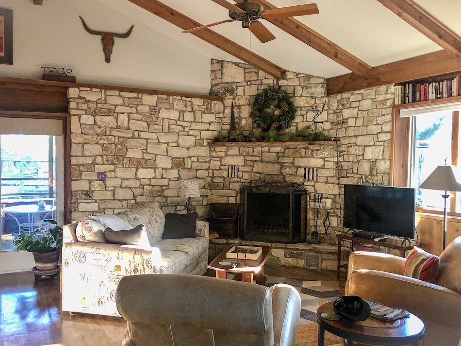 To a local laundrette and whilst our clothes were soaping walked to the post office; Chevy pickups, cars and trucks rolled by…people looking at us bemused, unused to roadside walkers. Mailed a Buc-ee’s T-shirt to Bruce in Seattle…he loves that store. Back to the laundrette to swap our clothes to the drier and a walk over to HEB to buy more food for Christmas Day. Laundry done we parked in Wimberley, explored the shops mostly selling the same stuff; didn’t want a pair of thousand dollar cowboy boots or a chicken painted on a tin sign. A constant stream of slow moving traffic crawls through town; a tourist destination for neighbouring states due to its proximity to Austin and San Antonio. Back at the Airbnb we set up with a tray of food, sat in the garden, 21 degrees with the wind chimes dipping and turkey vultures riding the thermals. Next door drinks with the owners round the fire, Ed and Scott. A little black cat slunk out of the dark wound round our legs. Heading back I walked smack in to a low hanging oak branch decked myself, flat out on the ground. Dave looking down at me: “What are you doing?” The cat followed, disappointed when we shut her out, hurling herself at the window in the door…yowling on the doorstep, settling on a porch sofa. I felt guilty.