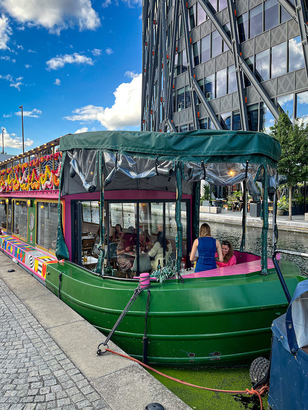 Covering a lot of ground in one day we made our way back via Paddington Station and the new Elizabeth Line…having a quick wander up into Paddington Basin where old canal boats have been repurposed as a restaurant, a coffee boat… even a cheese boat, but some still lived on.