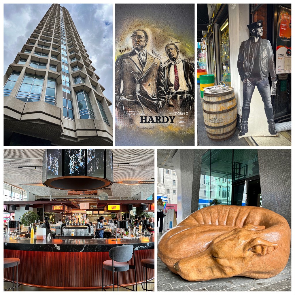 On to Tottenham Court Road and Soho. A cleaned up towering landmark, Centrepoint, which now has a bar and food place on the ground floor and a carved sleeping dog outside. Tom of Finland in Soho advertising vodka and Tom Hardy as the Kray Twins graffiti.