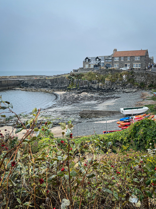 Further north we stopped at Craster Harbour in Alnwick, looking through the fog to Dunstanburgh Castle further up the coast. A peaceful fishing village with traditional fishing boats known as ‘cobles’. The small harbour was built in the 19th century to serve the herring fishery; curing sheds produce Craster kippers…the smell of smoked fish, pungent, delicious.