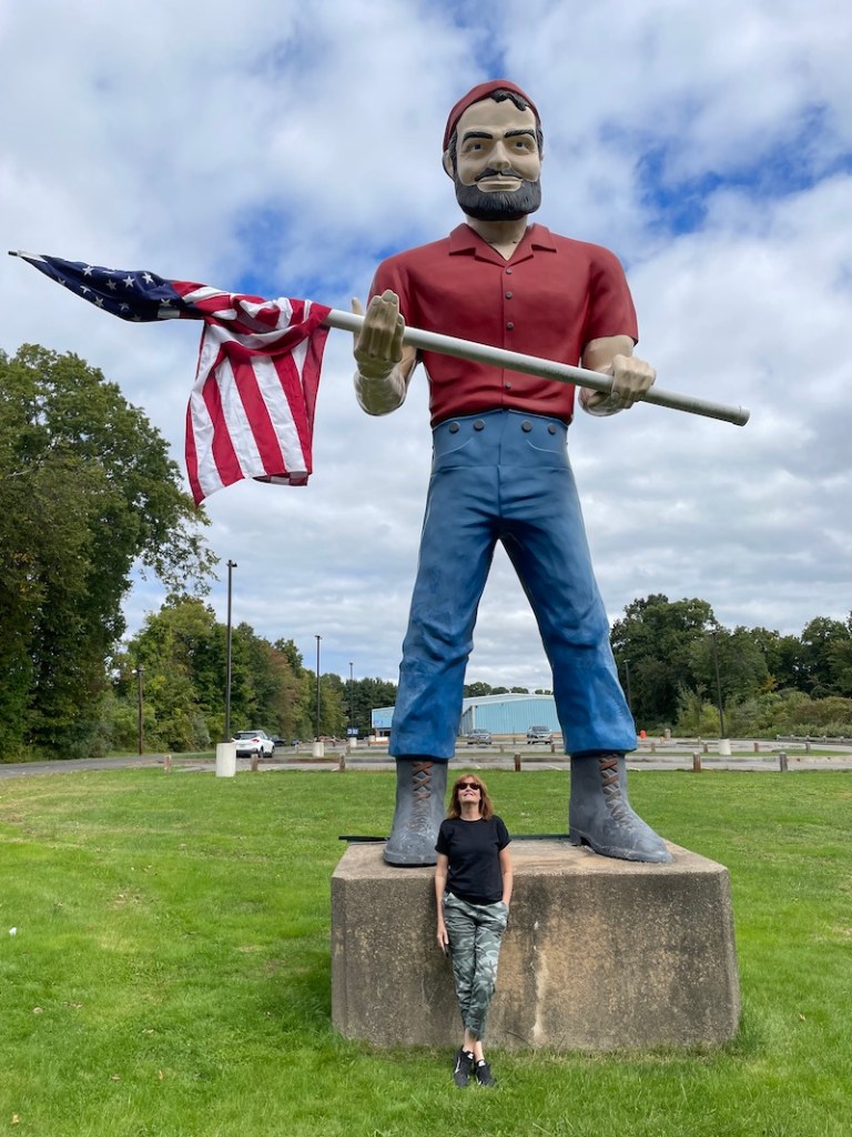 Driving by Hampton Falls Inn Dave said I hope they got him out. Over another State line back in to Massachusetts, through Tewksbury, Worcester, Berlin following the I-84, stopping briefly at Sturbridge….passing an RV with a full size plastic skeleton strapped to the back. Over the border in to Connecticut where we stop in Cheshire for a final roadtrip photo, another Muffler Man. Cheshire has a law dictating that no sign can be higher than 7 feet; to get around it by using this 26 foot high Muffler Man repurposed as another Paul Bunyan, local business The House of Doors replaced the axe with an American flag because as the business commented: ” You can build a flagpole as high as you want and the town can’t do anything about it.” The Muffler Man has since become an official landmark in the town.