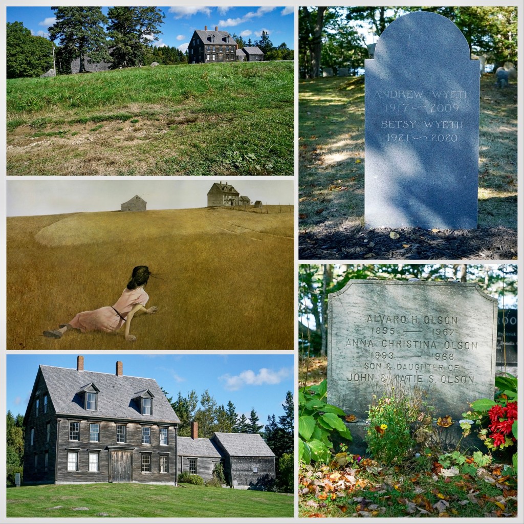 Leaving the barn (and its massive bathroom with heated floor) our end destination was Portsmouth for one night in New Hampshire…routing ourselves first to Cushing to visit the Olson House and nearby graves of Andrew and wife Betsy Wyeth and Christina Olson…set not far from the house tucked away in the tiny Hathorne Cemetery where other local people are buried beside them. Anna Christina Olson was the subject of Wyeth’s most famous painting ‘Christina’s World’, a scene depicting a young woman in a field, the woman’s limbs thin and her body appearing unnaturally aligned. Olson had a degenerative muscle disorder which physically left her incapable of walking….refusing to use a wheelchair she would crawl everywhere, something that Wyeth observed from his window as she crawled across a field. Wyeth’s wife Betsy posed for the torso of the painting as Olson was 55 years old by this time. The Olson house can be seen on the rise of the hill where Christina lived with her younger brother, both friends of Wyeth from when he stayed in a summer house in the area; they were often subjects of his paintings from 1940 to around 1968. The house still stands the barn now shielded by trees; Wyeth’s painting shows a wider separation between house and barn and the land lies slightly differently…but nothing much has changed. The Olson House is now a National Landmark owned by Farnsworth Art Museum (closed for refurbishment during our visit) and ‘Christina’s World’ is owned by MOMA where it has become one of America’s most iconic works of art.