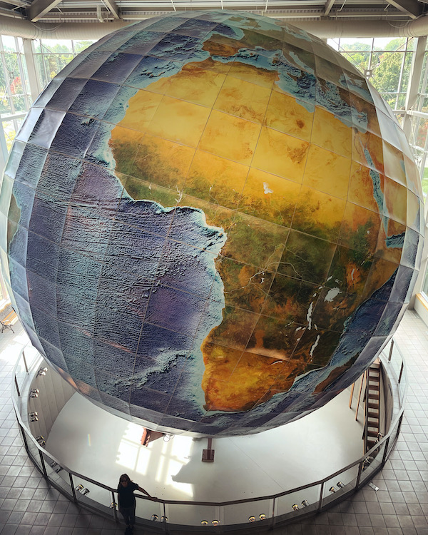 From Cushing picking up route 220 following the edge of an inlet to Waldoboro where we join Highway One Road heading West before dropping down to cross the Damariscotta River. On through Newcastle…passing back over the Sheepscot River through Wiscasset where a new line of people waited for food at Reds. More English town names; Woolwich… across the Kennebec River to Bath, Brunswick, through Freeport to Yarmouth where we stop to visit ‘Eartha’ allegedly the biggest globe in the world housed inside the headquarters for Garmin. Open to the public and free, we look for familiar places as it slowly revolves and tilts.