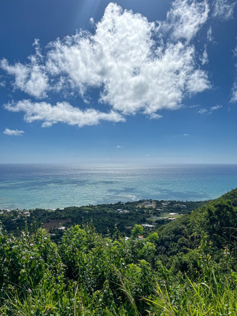 Thursday spent at the house, enjoying the downtime, the scenery. On Friday we head out for a day trip, following Adlin’s advice to drive the scenic highway route 3…through small towns, under mountains, roadside bamboo shooting upwards through the tree canopy, telephone wires pulled low by the weight of vines. Fields of crops; palm leaves, bananas?… fields for sale ‘Se Vende’. At Yabucoa, we hug the coast…the sea a sparkling azure blue, greenery thriving at the side of the road, climbing over everything creating an undulating humped border as it ropes between telegraph poles. The road climbs…my ears pop, we get out to look across to the sea.