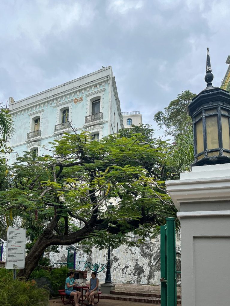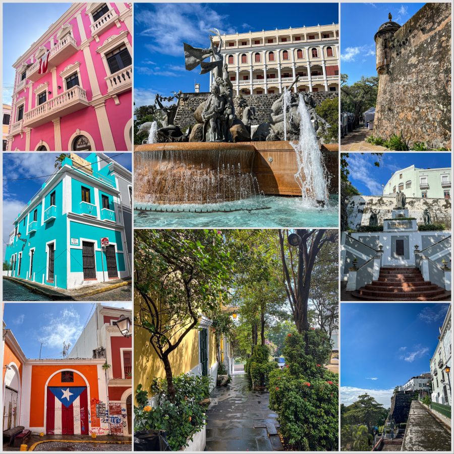 Back on the glistening cobblestones, the sun is out..brightly painted buildings like confectionary. We head down to Paseo de La Princesa a 19th century esplanade where an artisan market runs through…crafts, local sweet treats, food trucks and kiosks line the space behind. Looking up to Fort walls, statues, steps, benches, antique street lamps and near the harbour walls the large Raices (Roots) fountain depicting the islands cultural heritage of Taino, African and Spanish. I take a photo for a family in their matching red festive T-shirts.