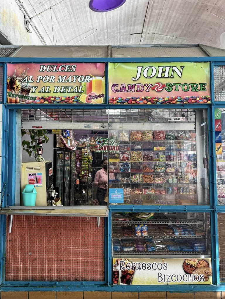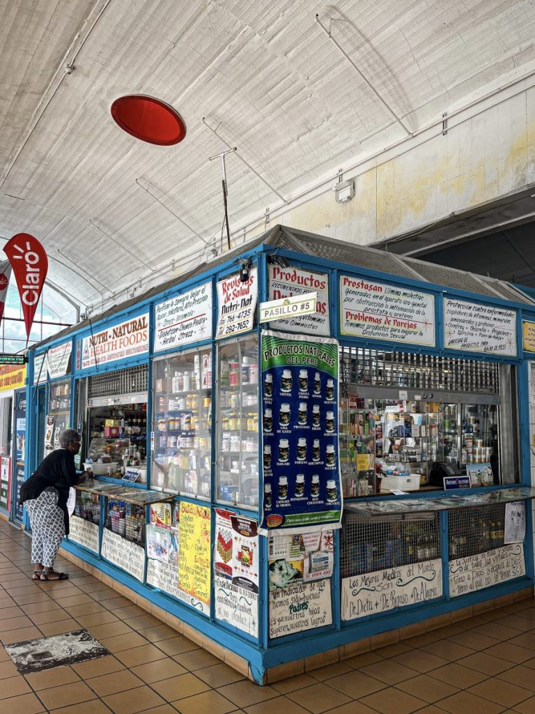 Reading a guide book I find mention of a local market so we drive further to the neighbourhood of Rio Piedras. Streets of ramshackle concrete apartments bloom with mould. The indoor market is housed in a large concrete building, almost deserted half of it shuttered; I expected vibrant colours, music and the bustle of pre-Christmas shoppers but it’s quiet. People smile and greet us. Chunks of salted cod, fruit and vegetables basics, kiosks selling local sweets, hair oils, lotto tickets…it’s a local traditional place and friendly.
