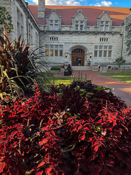 A roadsign: ‘Be an organ donor. Give your heart to Jesus.’ In Bloomington we eat great Thai food and walk in late evening sun around town, through the beautiful campus of Indiana University. Autumnal landscaping glows russet red and purple in the falling sun. Rolling grass, stone buildings…it looks wealthy. We buy ice-cream taking it back to sit in rocking chairs on the porch of the Grant Inn where we’re staying the night.