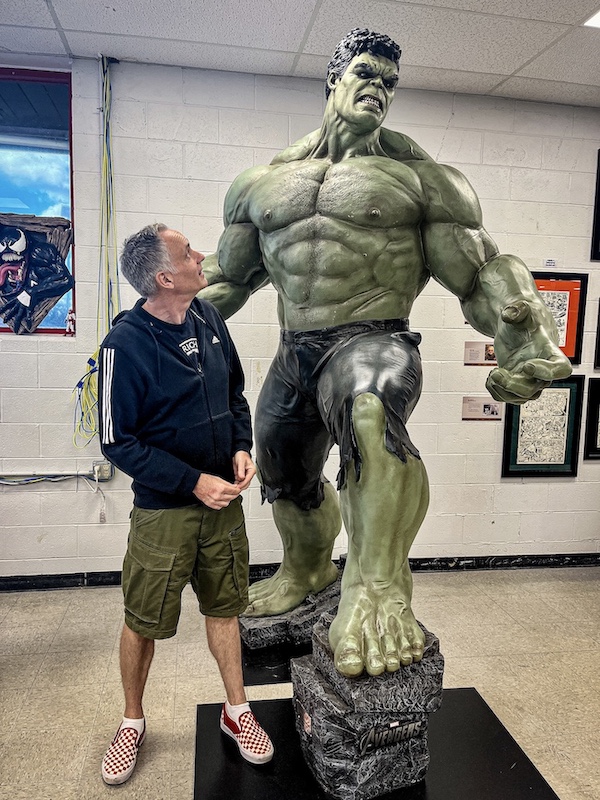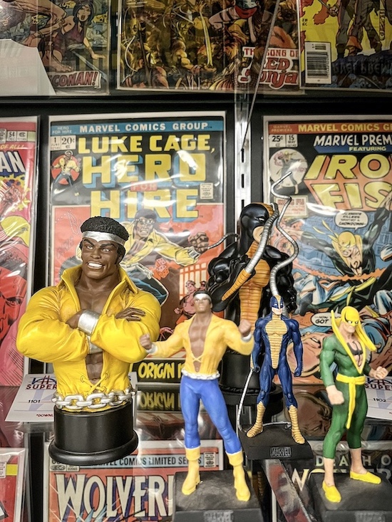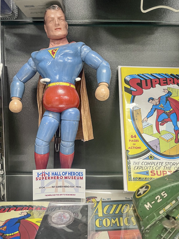 To the Hall of Heroes Superhero Museum where we meet John who shows us some fun stuff; mini comicbooks once dispensed by bubble gum machines, a Spiderman poster which was never used as it has the reflections of the Twin Towers in his eyes and the film release was shortly after 9/11. Models of Stan Lee and Chris Hemsworth as Thor have incredible airbrush detail. Luke Cage models, a show we used to watch…and the earliest Superman toy is on display. They have original costumes/masks donated and signed by Marvel and DC actors. Fun place.