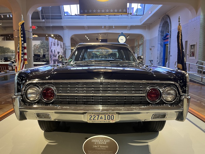 Early morning start. Breakfast at the standard Holiday Inn Buffet and leaving the hotel we joke with two boys in the hotel lift; about 7 and 8 years old. They walk out and one of them turns to say “You sound like you’re in a movie.” It’s entertaining to see how our English accents are perceived on our roadtrips around the US and in turn we love to hear the American accents from the different States. A long day ahead we start at The Henry Ford Museum in Dearborn, Michigan…a huge place where we spend about two and a half hours. This is the Presidential car that JFK was assassinated in.