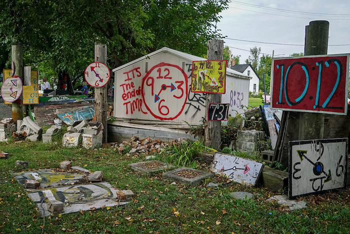 On to the Heidelberg Project in the McDougall-Hunt neighbourhood of Detroit. Started by Tyree Guyton in 1986 his upcycled trash art projects roll on for the entire length of the street. It’s been bulldozed by the city a few times there’s been fires, but it’s growing in to a larger community activated project which we both like the idea of. There is so much of it, some interesting some not…it’s hard to get in to someone’s head for this kind of thing but I liked the dotted house and the ‘time’ pieces…and I love that he’s got away with it because there is just so much stuff. Engaging and friendly Tyree hangs out at his roadside shack happy to chat and share his thought process.