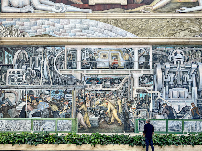 With 100 galleries it’s an astonishing collection. We are here to see the huge Diego Rivera Detroit Industry mural (1932-33); a series of frescoes consisting of 27 panels depicting the Ford Motor Company painted in one central ground floor room. Rivera thought these to be his most successful work.