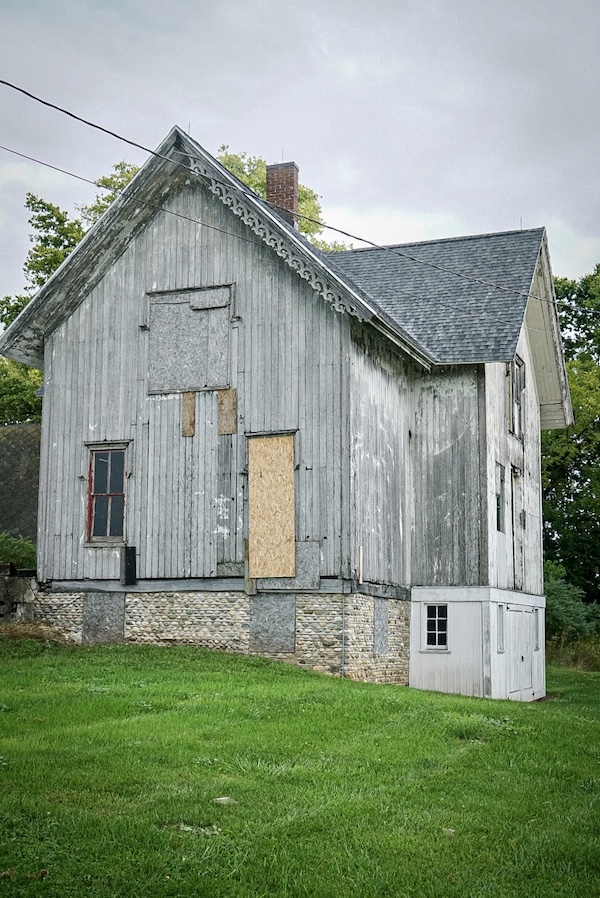 Driving Ann Arbor to Kalamazoo on the I-94 by Brill Lake and a highway roadsign declares: ‘After you die you WILL meet God!’ Rain catches up with us 30 minutes from Kalamazoo where another sign screams ‘There IS evidence of God!’ …we don’t find any but the next sign is a little less histrionic ‘Donut of the week! Pumpkin choco chip!’ Huge silos in Decatur. At Vandalia on Calvin Center road we stop to take a photo of the Carriage House, a stop on the Underground Railroad..standing across from the James E Bonine House.