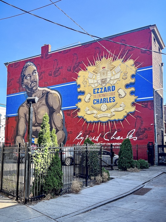 Mural credits: top left unknown. Top right neon by @insane51 Bottom left Ezzard Charles the Cincinnati Cobra boxer and jazz musician by @jasonsnell Bottom middle “End Homelessness’ ‘Housing is a Right’ designed by ICY + SOT with Artworks Cincinnati. Bottom right by @hera_herakut