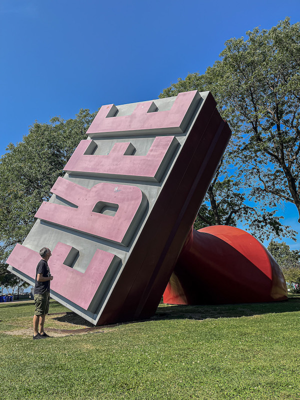In nearby Willard Park we photograph the world’s largest rubber stamp..28 feet 10″ by 26 feet by 49 feet. Created by artist Claes Oldenburg who was commissioned by the then named Standard Oil Ohio to stand in front of their headquarters. A change of management before the installation resulted in the giant stamp going in to storage where it stayed for seven years before it was offered as a donation to the city of Cleveland. Quoted from website Roadside America (which we use to find all the roadside oddities of the United States): “The rationale behind the word ‘free’ relates to its original proposed position in front of the BP Building, just across from the Civil War Soldiers and Sailors Monument, which, upright, it roughly resembled in shape. The word free has several meanings but the main one in this case, was designed to parallel the freedom of slaves but also — because the stamp pressed down on the word free — that many today still are not free.”