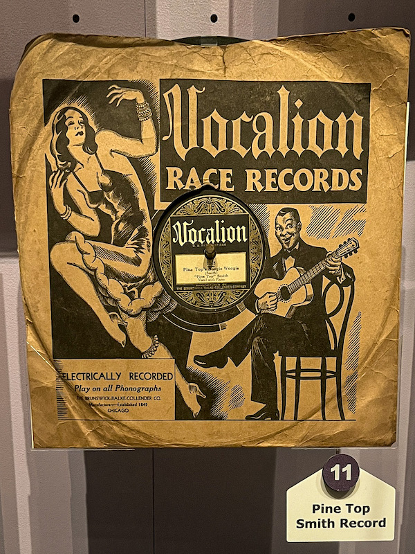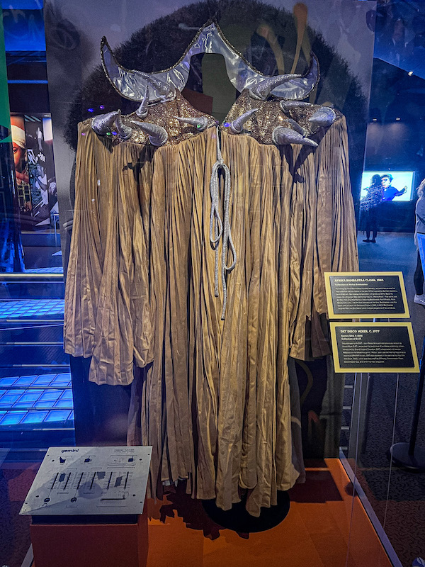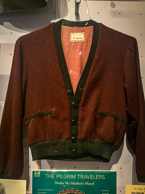 Driving through the typical ugly sprawl bordering big cities worldwide, we see the Cleveland skyline ahead. Another roadsign ‘Jesus is a map to the Treasure.’ There’s a lot of God in America. First stop the Rock & Roll Hall of Fame. The grey glass pyramid looks tired, inside the lighting is terrible, too dark…we’re stooping to read information…the building looks dated. We start in the HipHop exhibition and work our way around. It’s a confusing layout, no obvious route to take. Headphones positioned to listen to music are shredded and dirty, falling apart. There’s an interesting collection here but it needs a cleaner brighter updated venue to showcase it. Among my favourite pieces are Stevie Wonder’s elaborately beaded shirt from 1983, Sam Cooke’s cardy from 1952, a Pine Top Smith record in a great Vocalion sleeve and an Afrika Bambaataa cloak from 1983.