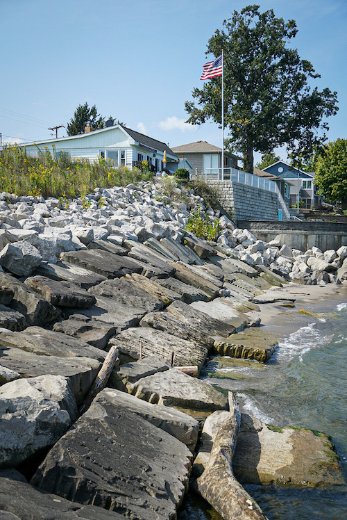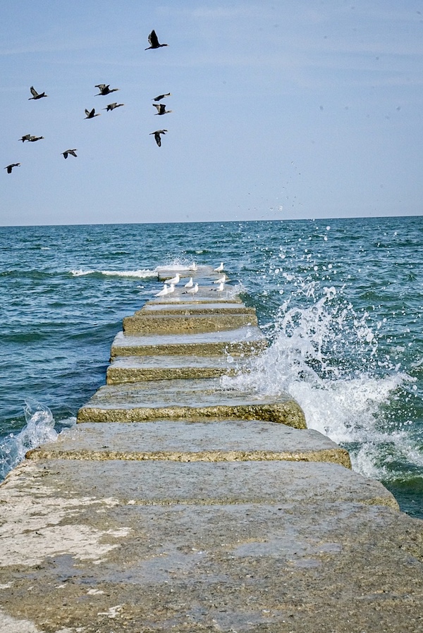 We’re heading to Sandusky. Hugging the Lake Erie shoreline…upscale neighbourhoods like Bay Village in Westlake with private no trespassing lakeside views, sprawling houses with castellated turrets, huge carports, fake English Tudor. Further along the road the vast NRG energy plant with its towering chimneys and electricity pylons. We pull over before the town of Lorain to sit by the shore of Lake Erie, watching waves spume over a concrete jetty, gulls flare in to the sky. Hard to imagine it as a lake…so vast it’s like looking across an ocean.