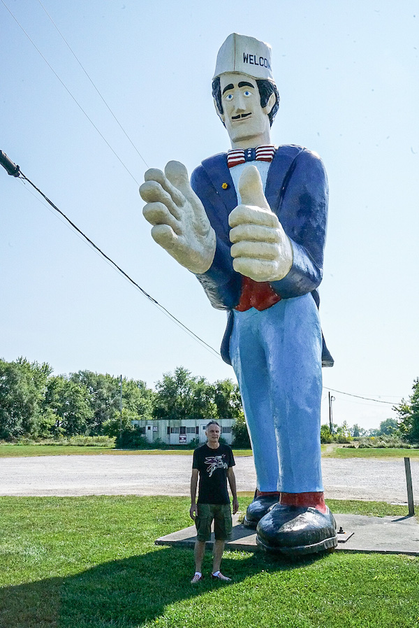 In Sandusky the Merry-Go-Round museum is closed for repairs due to getting hit by a storm in August. I’m gutted, I love the carved carousel horses. Back on to Highway 2 instead crossing Sandusky Bay…houses with boats cluster the shoreline. Coming off the bridge in to Danbury. Sign: ‘Marblehead Fish Cleaning We Do Good Work No Bones About It’. Signs for sea wall dredging, Gem Beach Marina, RV Parks and Victorian Inns. Wide empty bulldozed lots. We’re looking for the giant handed Jacque statue in Marblehead, refurbished in 2020 looming outside a moose branded ‘Mickey Mart’ where a note on the inside of the toilet door advises me that Ottawa County asks me to wash my hands…an older gentleman has a 12 pack of Mountain Dew under one arm and a 12 pack of Coors Light Beer under the other. The Jacque statue doesn’t disappoint…his hands are indeed giant. He used to hold a tray but restoration replaced the original hands that collapsed…possibly under the weight of the tray?