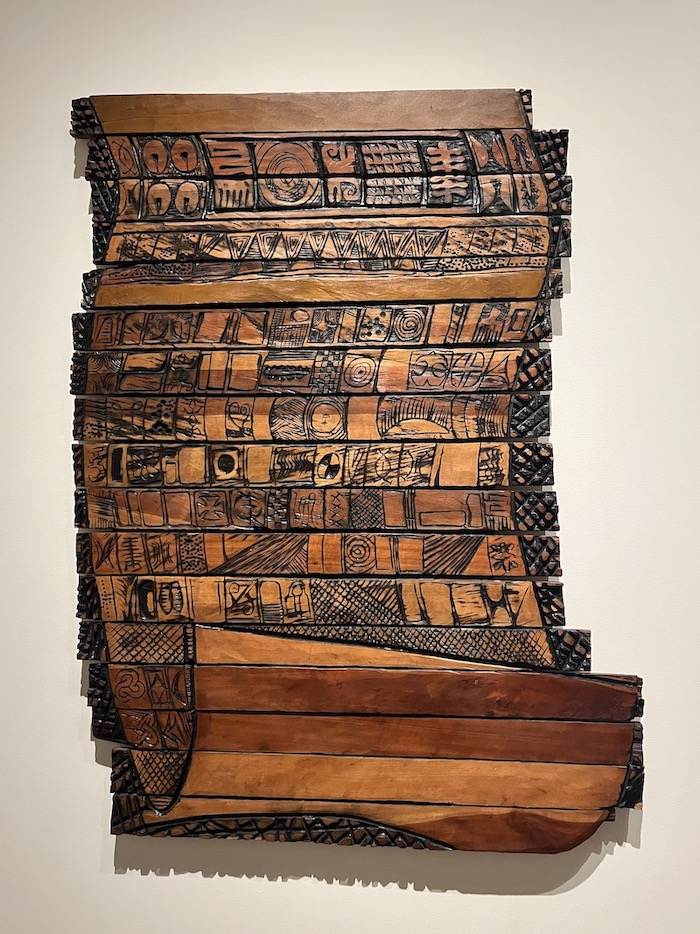 A carved and burned wood piece by El Anatsui. Henry Moore reclines in front of a large Louise Nevelson installation. We see so much. It’s a fantastic collection.