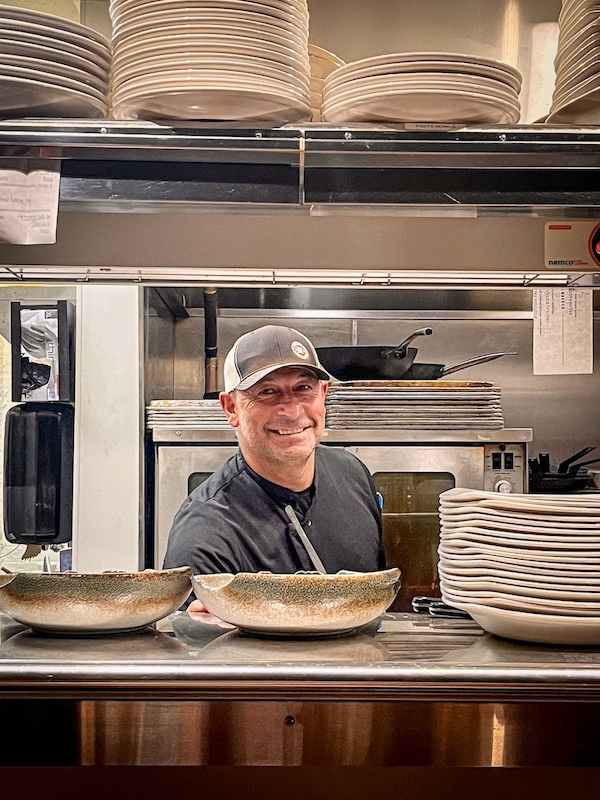 We eat a fabulous dinner at Souk Mediterranean Kitchen and Bar. Seated in a booth near the partly open kitchen and serving station, the staff collect to take the evening’s menu instruction from Chef Moussa Salloukh…and I’m propelled straight in to an episode of the excellent tv series ‘The Bear’, a moment of restaurant theatre. And wow the food. The best calamari starter we’ve ever had and despite the more elaborate dishes we were craving pizza…it was delicious. So much flavour…a traditional spicy sausage and pepperoni, the other a flat bread Middle Eastern blend of houmous, crunchy chickpeas, sun dried tomatoes, za’atar…the plates of dishes coming out to tables look mouthwatering. Great service, the place flowing like a well ordered machine, a big space but packed out. I’ll say it again…wow! The food. I’d fly back just for this place. I grab a quick photo of Chef as we’re leaving.
