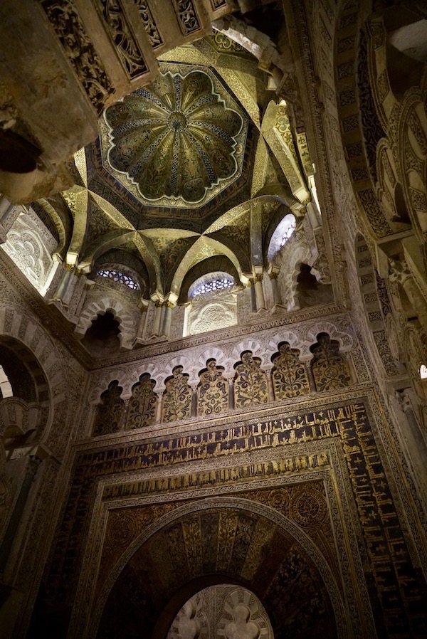 A tasteless touristy lunch of below average breaded ham with oxtail and fried calamari, the restaurant with outdoor tables simply too convenient for our 3pm tickets for the nearby Cordoba Mosque Cathedral. The meeting of two religious cultures on this architectural scale is incredible. The building originated as a mosque in 785 and was expanded up until the year 971…the original Islamic part of the building is my favourite, glorious vaulting arches of subdued candy stripes of red and cream dominate the central nave and prayer hall, its repetitive two tiered arches rolling overhead. The Mihrab (a niche symbolising the direction of prayer) is a chamber with such gorgeous mosaics and stone carving and a shell shaped cupola so stilling in its beauty that I am awed looking up in to it. It is breathtaking and I love it. It was my reason for including Cordoba in our trip and worth any detour you can take if visiting this country.