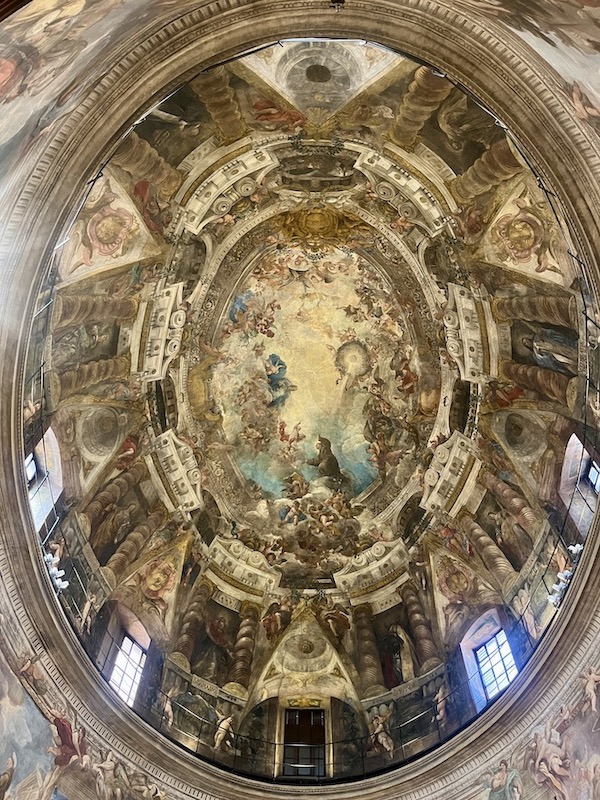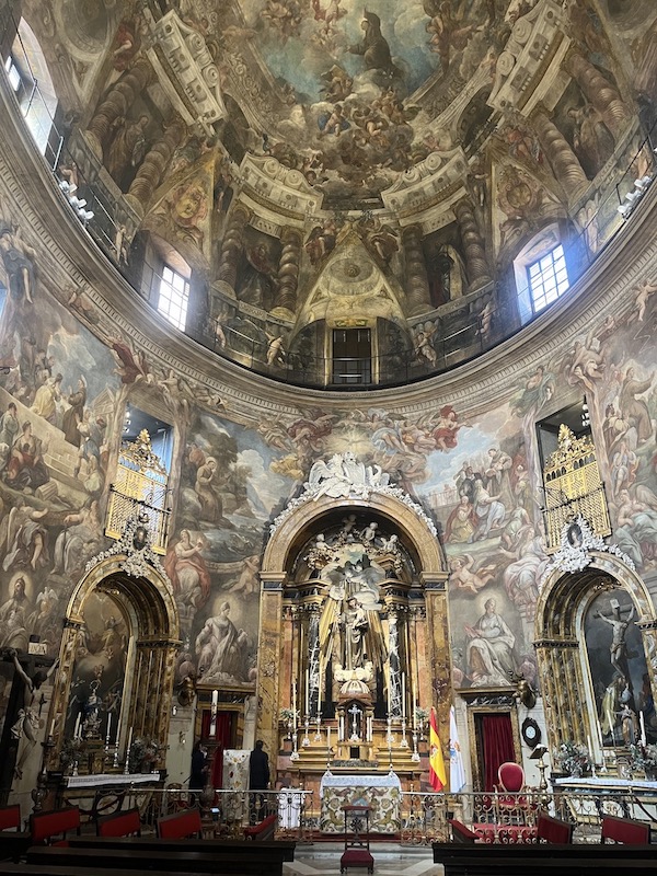 On asking Olga about her favourite places in her city she told us of Iglesia de San Antonio de los Alemanes (Church of Saint Anthony of the German) on the corner of Calle de la Puebla and Corredera Baja de San Pablo. Our final stop of the day, this 17th century baroque building dates to 1620, originally ordered by King Felipe III when Portugal was under Spanish rule for Portuguese migrants. When Portugal gained independence the name was changed and it was dedicated as a refuge to German immigrants. It is covered with frescoes…every space filled by a painting, apparently one includes the wife of painter Luca Giordano who alongside the painter Francisco Ricci created this incredible display. I have never seen a church so completely painted…the eyes rove overwhelmed by an excess of beauty which is softened by the diffused light entering the windows high in the dome.