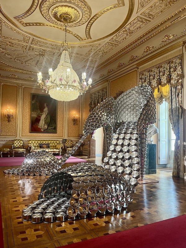 We’ve been to Spain a few times, to Barcelona, Grenada, Murcia, Cartagena…and Dave to Madrid for work, and it’s a place I’ve wanted to visit because this is the home of Picasso’s anti-war painting ‘Guernica’. From New York to London for 2 days to visit family then a 2 hour flight from Heathrow. Checking in to our centrally located hotel I see a leaflet for one of my favourite installation artists; Joana Vasconcelos is showing at the Palacio de Liria. I’ve only seen her art in photographs so this is a treat. Our first destination decided we stop en-route to eat tapas up some steps from the hotel in a shaded landscaped square. To Calle de la Princesa where Vasconcelos’s art complements the grandiose surroundings of the Palacio. The chapel filled with a huge fabric heart its ‘veins’ pulsing light to the song ‘Hallelujah’, her giant stilettos made from household cooking pans and lids…the suspended rotating black heart an intricate maze of disposable plastic cutlery. More installations reach out in to the grand spaces they occupy, suspended in stairways holding court in grand rooms…an elegant and thrilling juxtaposition.
