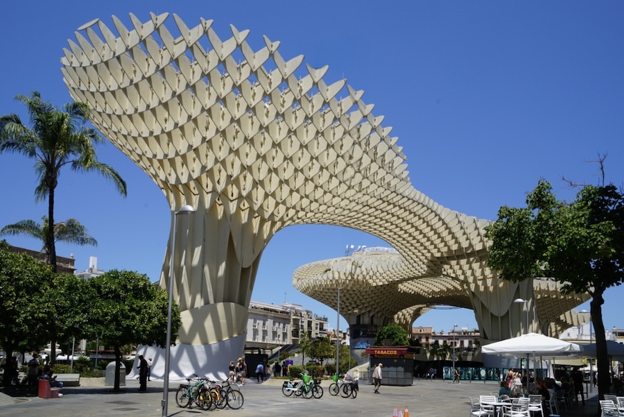 A short train journey an hour to Seville. We check in to our Airbnb above a tapas bar, it’s okay but very dark, designed no doubt for the scorching summers but hardly any light gets in and the inner courtyard private to our room, is enclosed trapping the air. The main living area is dominated by a huge black TV and console and 1980s glass topped tables…4 of them of varying size. We escape to explore, walking to the Setas ‘parasol’ contemporary walkway but found it ugly and disruptive to the space, I can’t imagine living overlooking it. We decided against paying to walk the top of it and instead go to the plaza of the huge cathedral and Alcazar…finding that they’re both sold out so we book tickets online for some late available time slots on Wednesday. It’s a new way of living, everything so hugely promoted in the digital age that if you don’t book in advance you don’t get entrance…which in turn results in a restrictive timetable. Travelling doesn’t feel as carefree. Horse and carriages carrying sunburned tourists clatter across the cobbles, the heat is rising, we’re both a bit irritable so we give up on sightseeing and decide to eat tapas in a shaded narrow street.