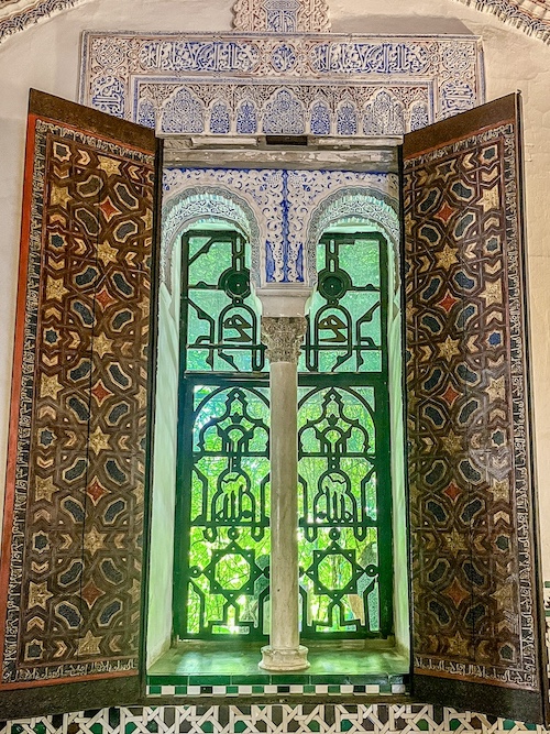 From the Cathedral to the Royal Alcazar Seville entering through the Gate of the Lion into the historic royal palace, one of the official residences of the Spanish royal family (they get all the best stuff). A 10th century former site of an Islamic era citadel developed through different dynasties to the 13th century, then progressively rebuilt with new palaces and gardens. Miles of tiles are gorgeous, the windows and wooden shutters are inviting portals. The Patio del Yeso (Courtyard of the Plaster) is one of the few remaining structures from the 12th century Almohad-era. The serene patio de las Doncellas laid with marble pavements in the 1580s. Ground level reception rooms line an oblong reflecting pool. Looking up into the dome ceiling of the Hall of Ambassadors is dizzying…it is all dreamlike….gorgeous. Sadly at 40 degrees, we pant around the gorgeous gardens but it’s just too hot and with no shade we’re quickly wilting. I could spend so much longer here but visiting two huge sites in one day and in this heat has worn us out.