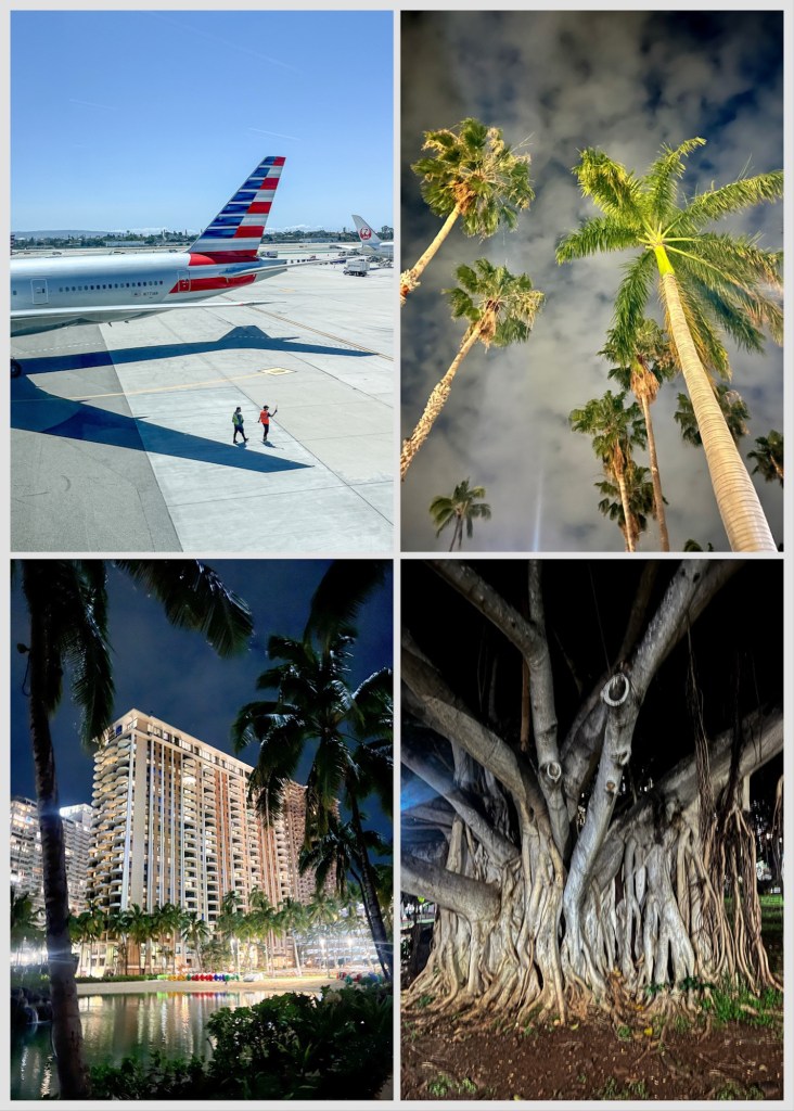 April 14. Started out today on our 5 month travel journey, first stop Hawaii…my 50th US State! 22 hours from leaving the airport hotel and a 5 hour layover in LA airport. 10,000 steps walking circles round LAX. First plane, quiet, a row of 4 emergency exit seats to ourselves. A cold coconut oatmeal breakfast with blueberries…delicious. 6 hour flight. Second plane smaller/older/packed 5.5 hour flight, a stingy bag of pretzels and a cuppa. Honolulu on O’ahu by 7.30pm walking among high rise hotels, tourist shops and Waikiki Beach. I swear I heard someone singing karaoke to Billy Idol Dancing By Myself. It’s warm and the air feels and smells tropical.