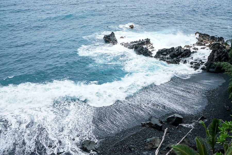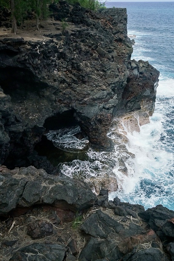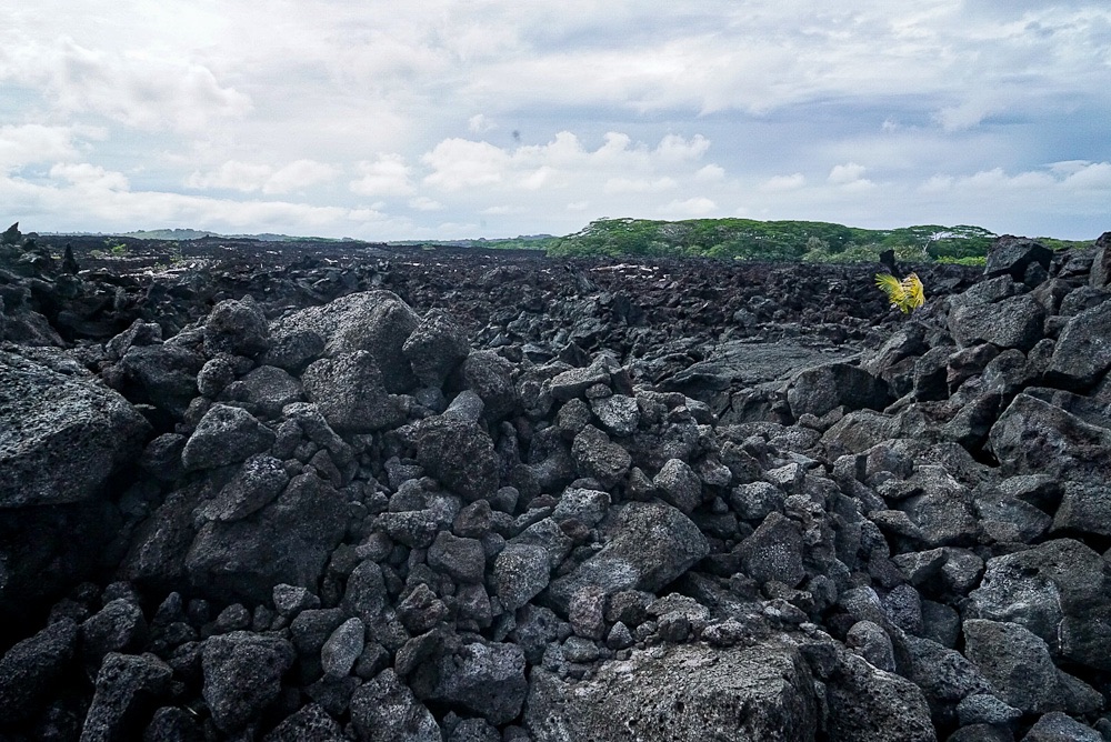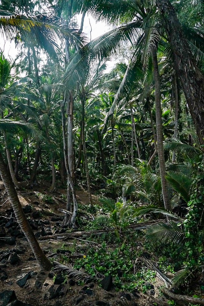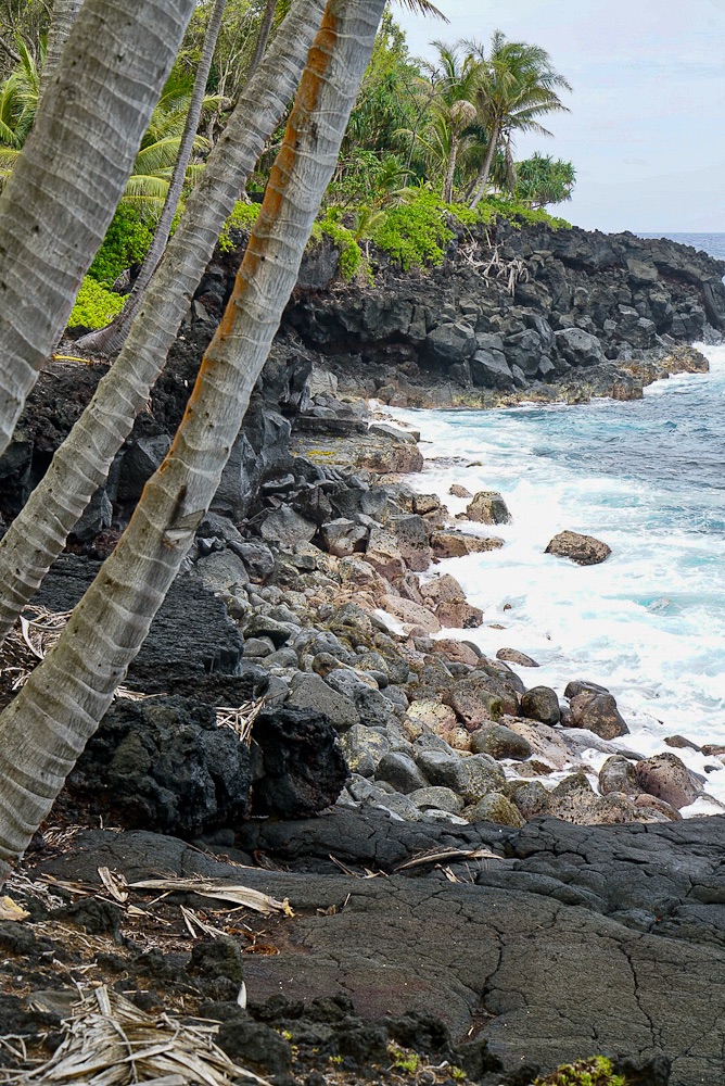 Driving from Pahoa south to Kalapana to get on the scenic ‘Red Road’ following the coast. Stopping at Kehena Black Sands Beach on to Lauhalaland’s black sand cove and palm trees. At Mackenzie State Recreation we see dramatic views of waves crashing against lava cliffs. There’s a sunken lava tube (too dark to photograph), a coconut grove dense with palms lava tide pools wash at its edge. There’s a blue tent pitched deep in the trees.