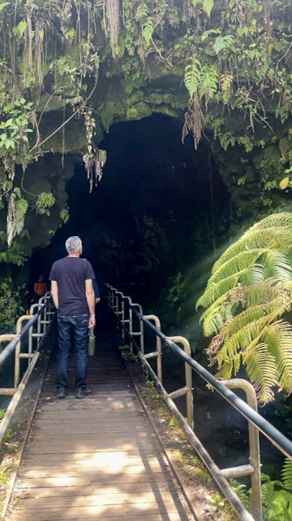 April 17. A visit to the Hawaii Volcanos National Park a 50 minute drive from where we’re based near Pahoa. $30 entrance fee per vehicle which covers re-entry for 7 days…America might not be perfect but it’s excellent at maintaining incredible National Parks. Walking through towering unfurling ferns and palm trees to the 600 feet long Thurston Lava tube (Nāhuku). Formed by a river of lava flowing in its own channel, its central core reaching 1,090 degrees C (2,000 degrees F). As the surface cooled its crust hardened. The eruption stopped, the lava draining away leaving a long lava tube or tunnel which took about a year to cool down.