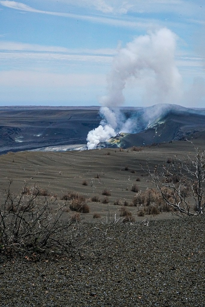 Drove the Crater Rim to see steam vents and the active Kilauea Iki and the Halema’uma’u pit crater. Locals believe the goddess of fire lightning and wind Pele (Peh-leh), inhabits the pit crater; we see old offerings of Lei (flower garland) left along the route. I can’t give all the facts as there’s too many but incredible to see it and learn of the devastation it caused in 2018 when it wiped out over 700 homes. Smoke was pouring out non stop today and lava fountains are forecast next week…not sure if that will happen before we leave but would love to see it.