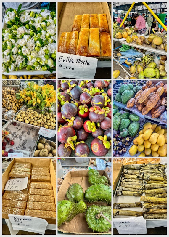 April 18. To the farmers market in the town of Hilo a 45 minute drive north sitting on a coastal bay. Loads of different fruits and we finally found tomatoes…sold out in the supermarket which was odd. Bought fresh coconut from a very abrasive Hawaiian lady doing a brisk trade…she was fascinating. Ginger jams, fiddlehead ferns, mochi cake (bought some/not very tasty/chewy), lots of purple mangosteens. A wander around town, weather worn buildings, torn moldy awnings…ocean air plus rainforest humidity take their toll. Some of the shops on the front sold posh dresses. We see a lot of hippies, lived in tans tattoos…the occasional amusing hat.