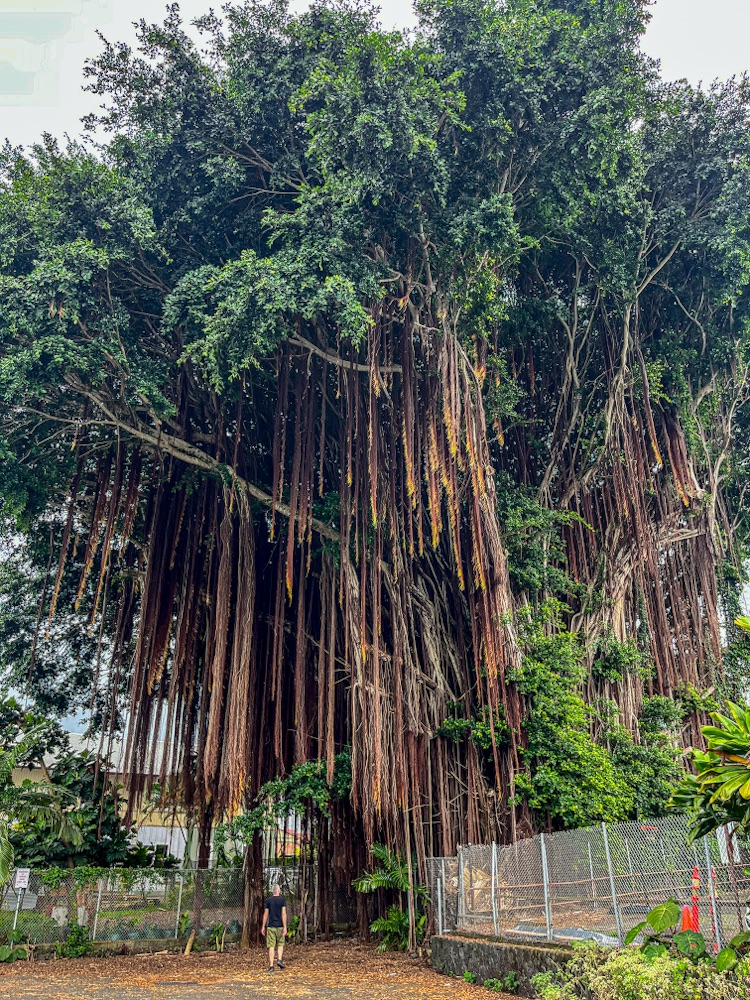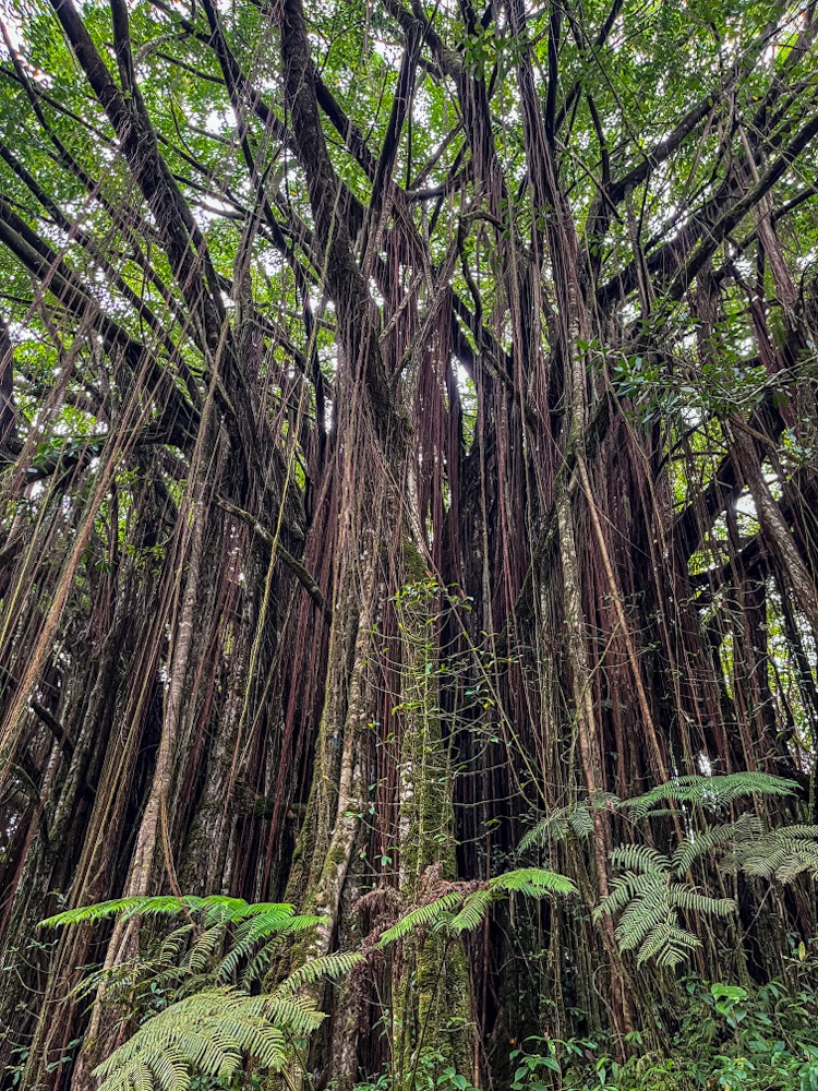 Turning inland to visit ‘Akaka Falls State Park, only $6 entry fee each. Walking down through tropical green, super tall stands of bamboo, massive spooky Banyan trees…then up a bunch of steps to vista points overlooking first Kahuna Falls in the distance and much closer, ‘Akaka Falls dropping 442 feet in to a gorge. Met a couple living in Seattle with their two young boys. One asked Dave which football team he supported…on replying “Spurs” the youngest kid replied “sorry”.