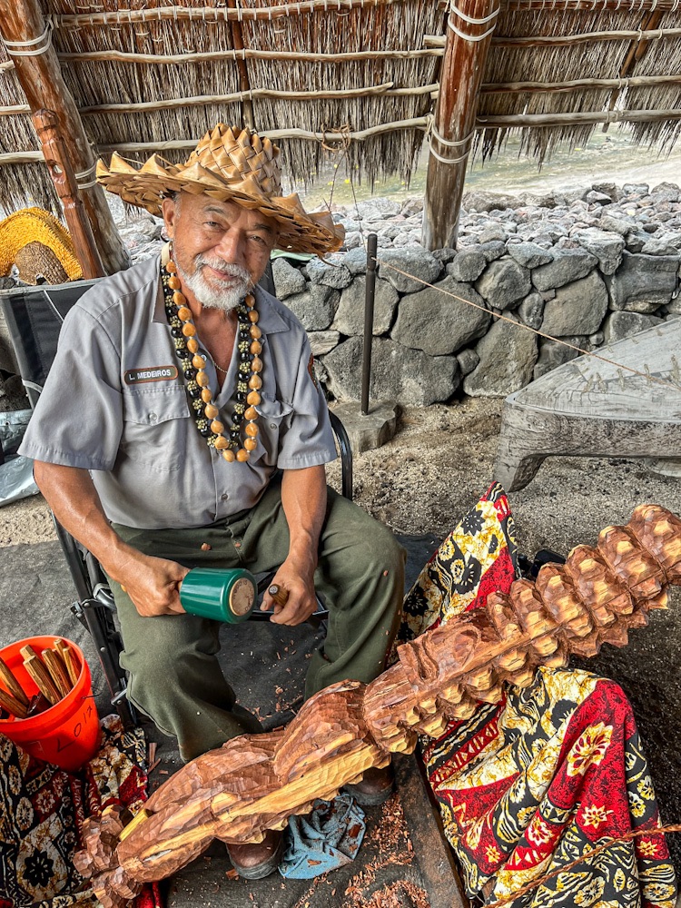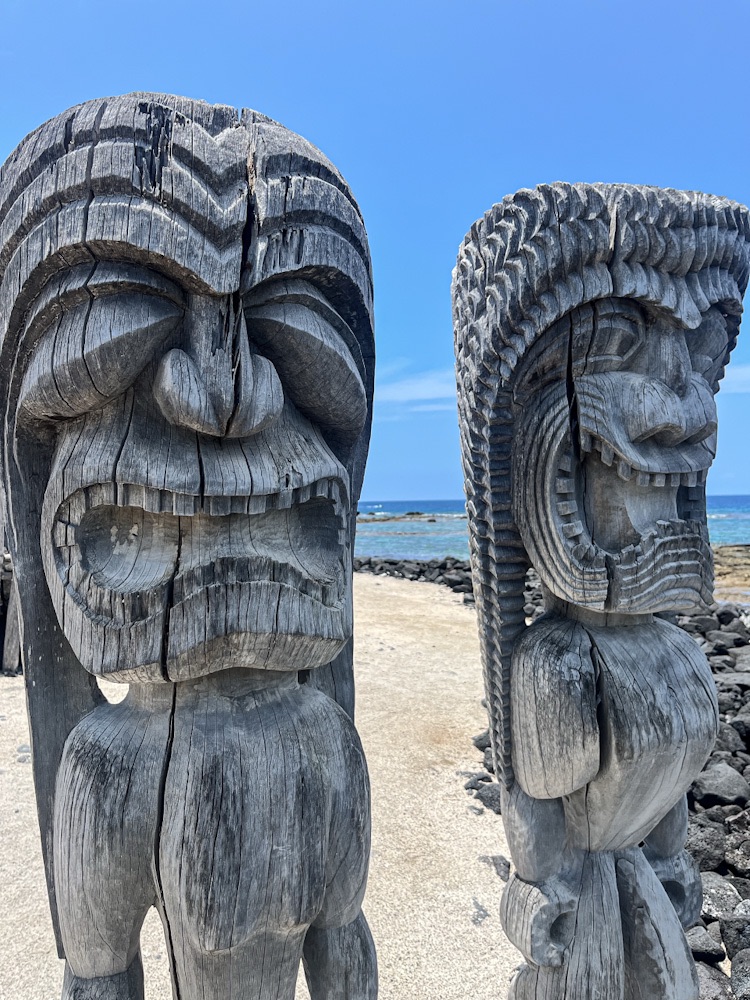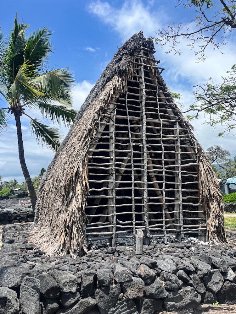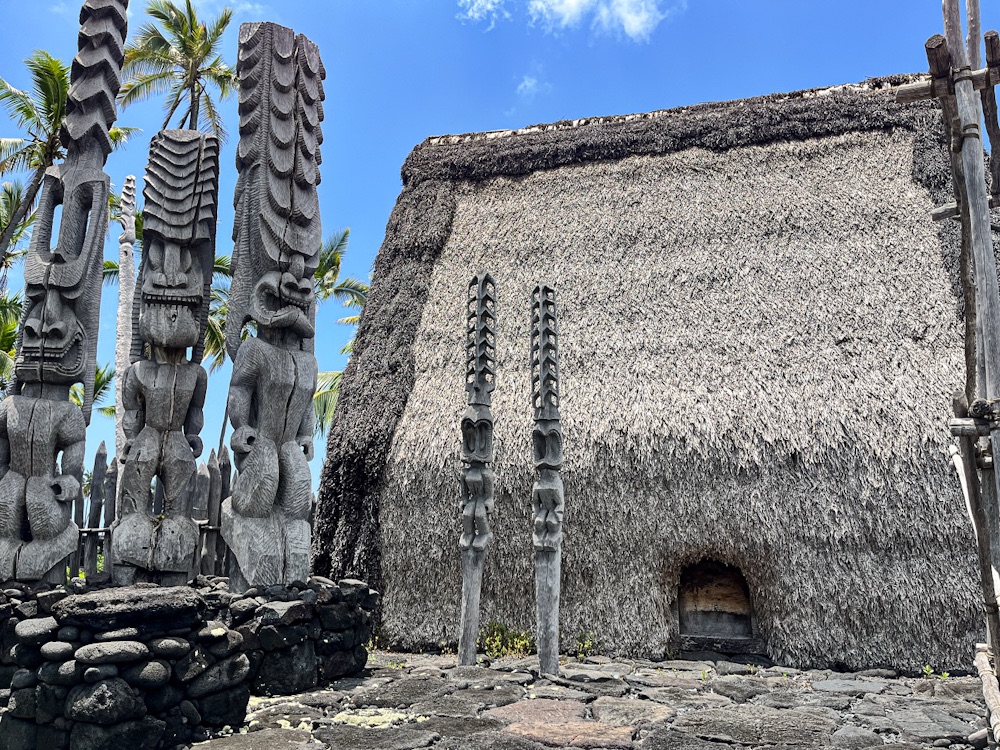 We stop at Pu’uhonua Honaunau National Historical Park. The site of a preserved spiritual sanctuary city, the Hale o Keawe temple and several other thatched buildings have been reconstructed based on originals thought to date to 1650 AD. Up until the 19th century Hawaiians (often defeated warriors) who violated one of the ancient laws (kapu) could flee here avoiding death and be absolved by a priest and freed.