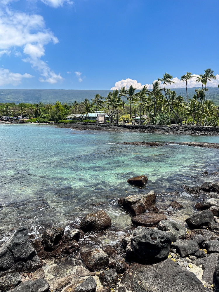 We wander out and around the corner to paddle in the cool water of Honaunau Bay, home to a canoe club, several boats pulled in on the grass. People are snorkelling, picnics set out on the lava rocks…everywhere lava.