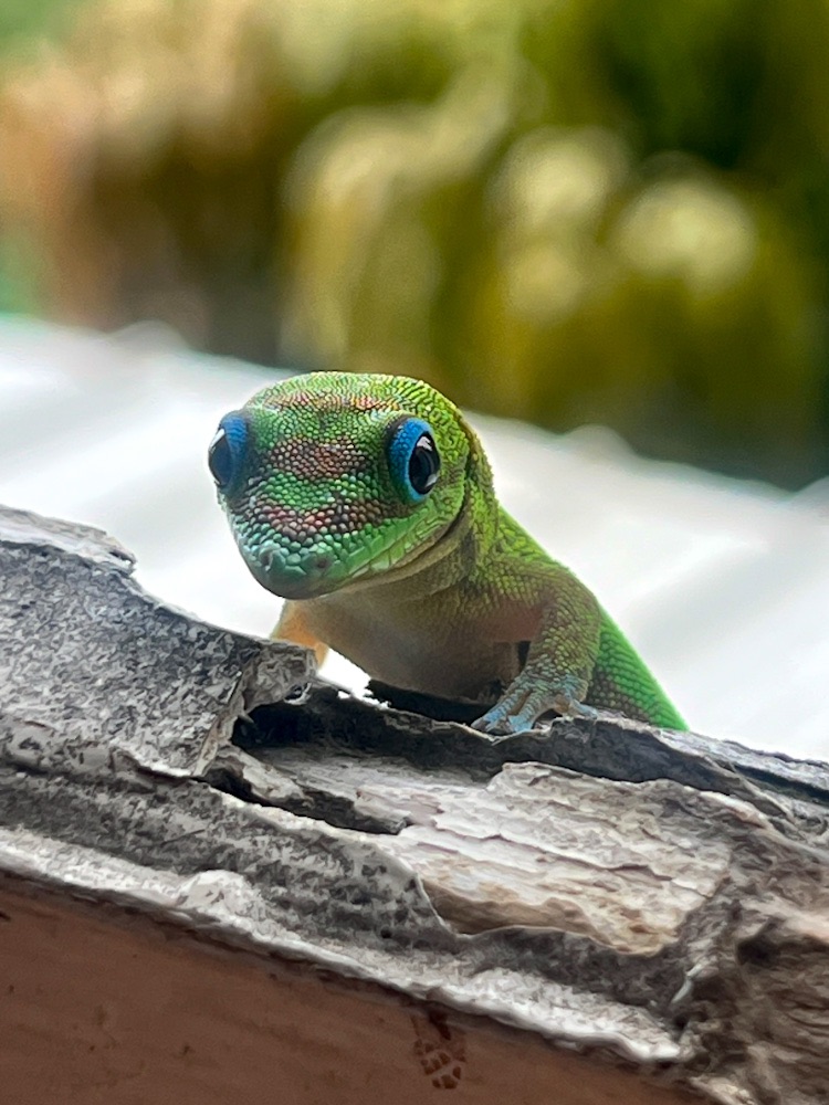 April 16. Woke at 5am, had a decent sleep despite the small double bed hard up against a wall my side a wooden shelf the other. Laying in bed look up to see a Gold Dust Day Gecko skitter across the ceiling catching flies. Most of the Coquis quiet now but still some chirping. A constant chatter of birds, rainfall…then glistening palms wave in a breeze. Dave makes us breakfast with fruit and plans our day, routing a local drive.